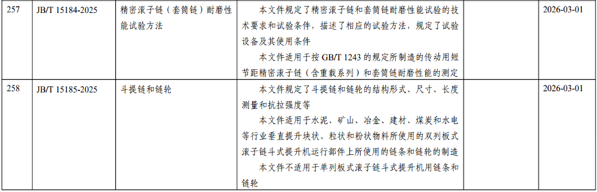 2025年9月9日,工业和信息化部发布2025年第19号公告,正式批准由全国链传动标准化技术委员会(SAC/TC164)归口制定的两项机械行业标准——JB/T 15184-2025《精密滚子链(套筒链)耐磨性能试验方法》和JB/T 15185-2025《斗提链和链轮》。新标准将于2026年3月1日起正式实施。两项标准的发布,是对我国链传动领域标准体系建设的完善。